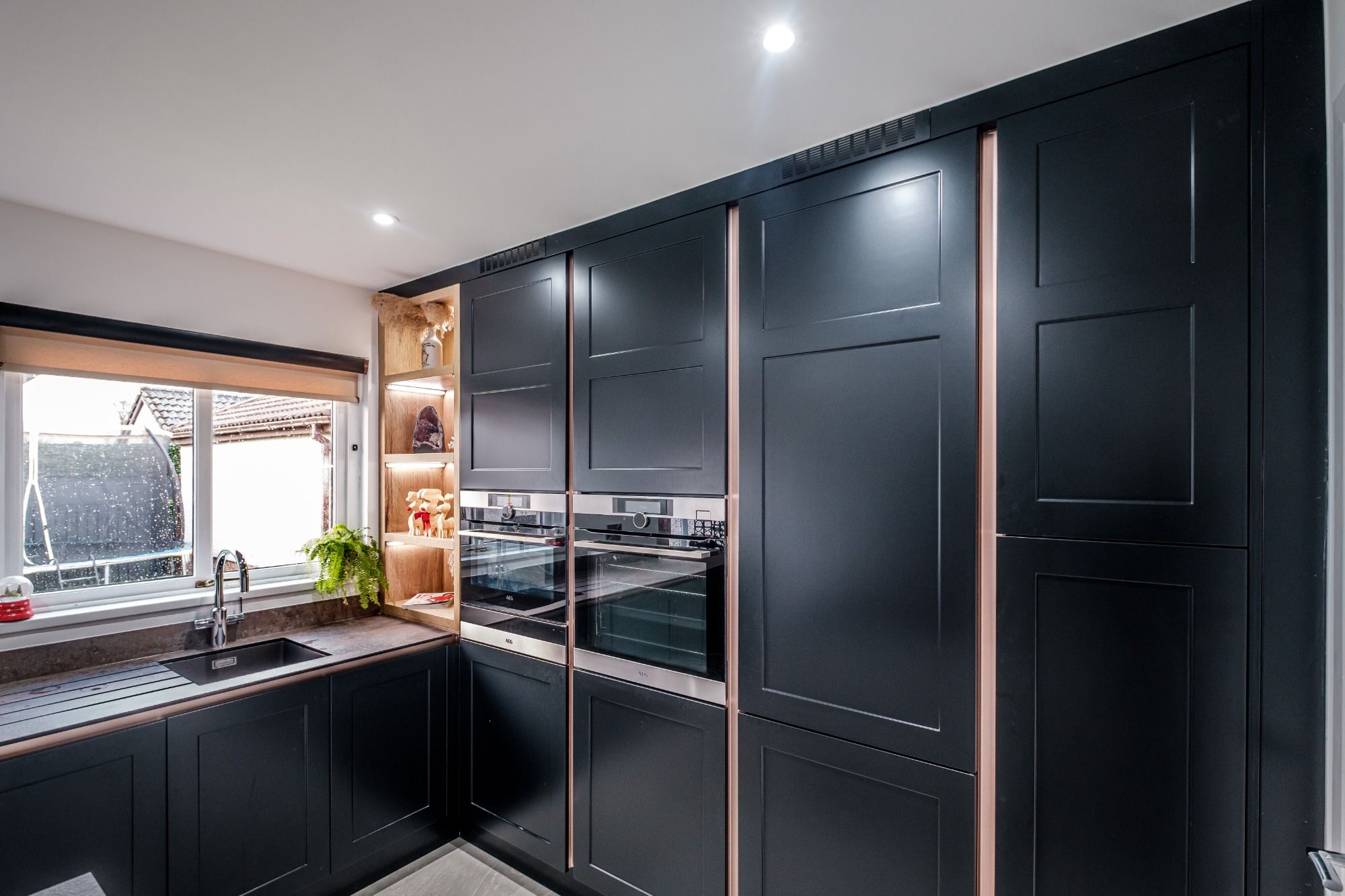 Matt Carbon Hunton and Dove Grey handleless doors with Zenith Caldeira worksurfaces