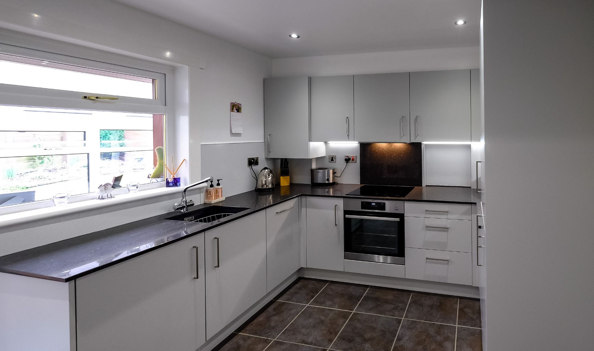 Supermatt Light Grey doors with Silestone 20mm Arden Blue worksurfaces